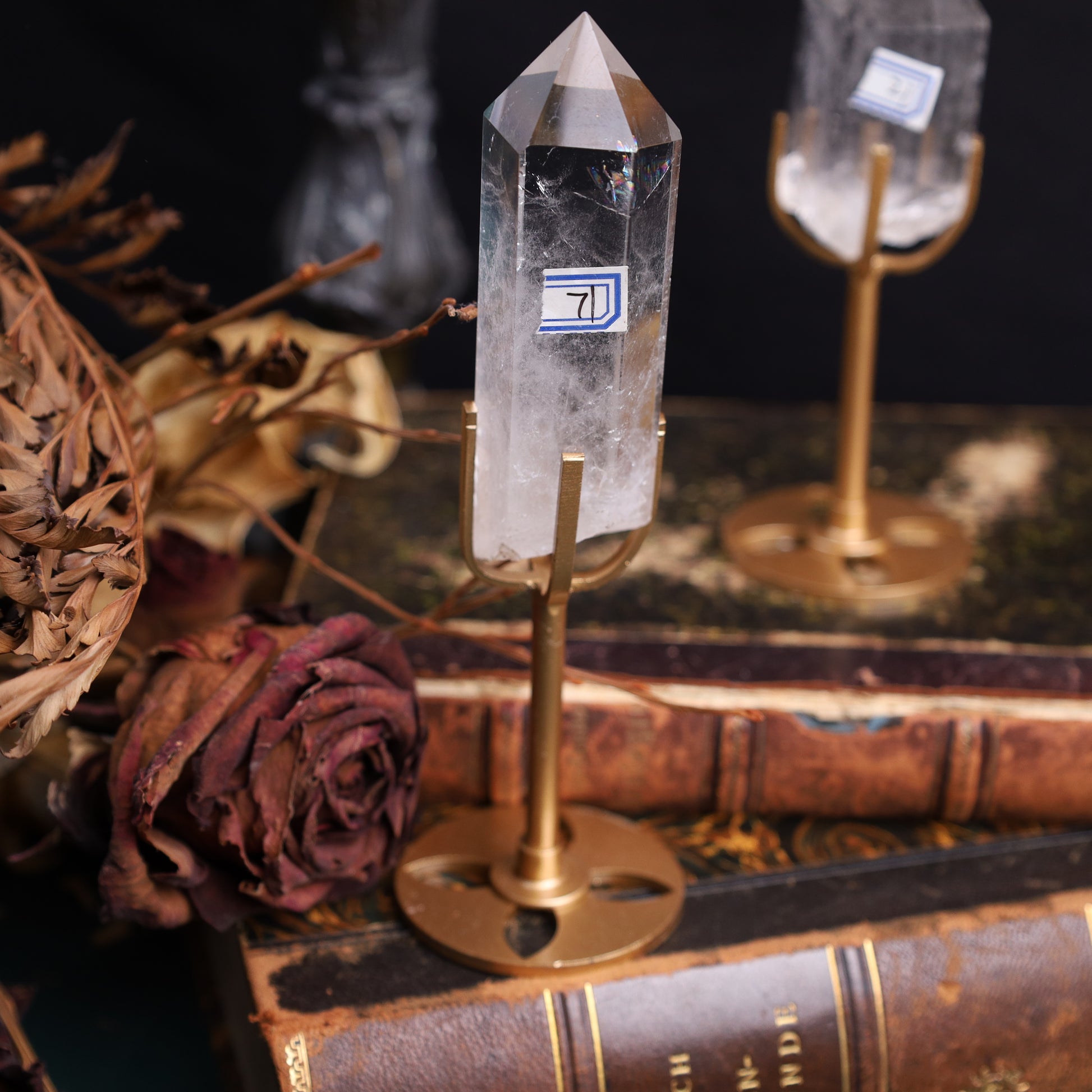 Jede Spitze sitzt sicher in einem goldfarbenen Metallständer, der den Stein leicht erhöht und ihm eine fast zeremonielle Präsenz verleiht. Der klare Bergkristall bricht das Licht in feinen Reflexen, während das warme Gold des Ständers einen edlen Kontrast setzt.