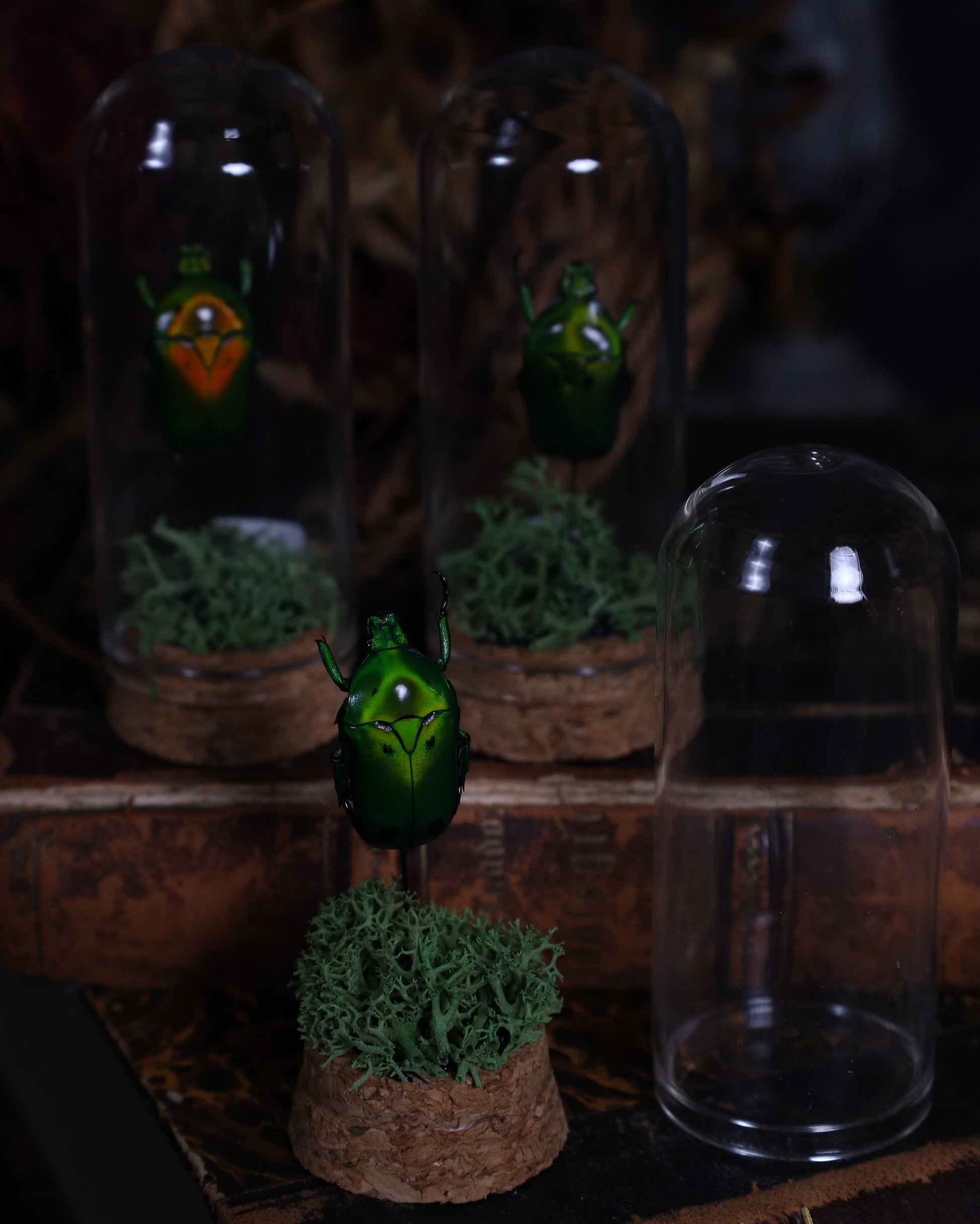 Each beetle is prepared with the utmost precision, positioned on a real bed of moss, and sealed under a clear glass bell.