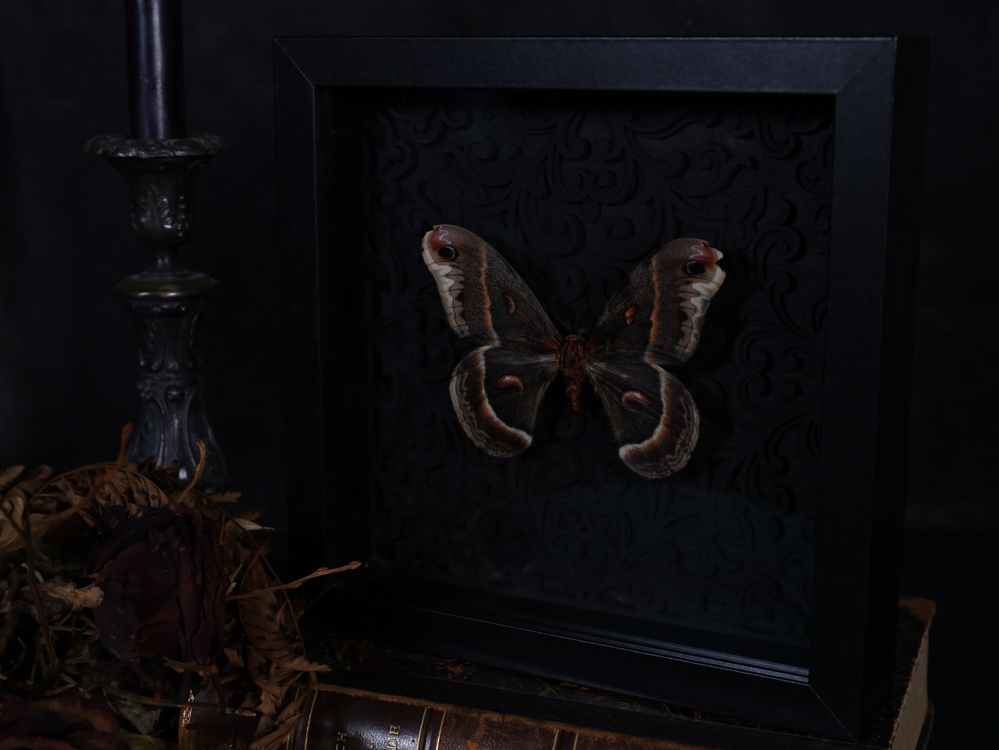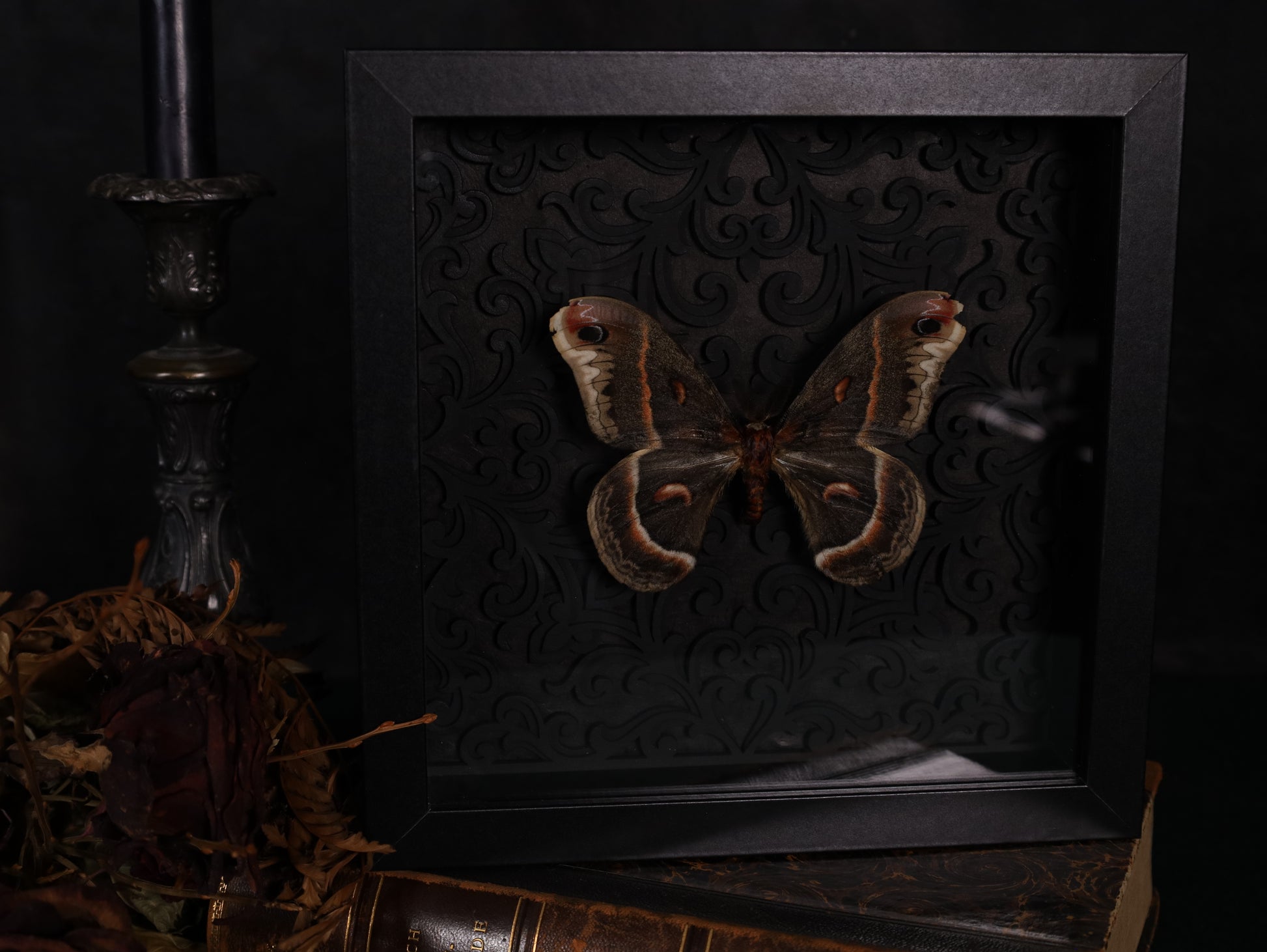 Hand-prepared and mounted on an artistic 3D Gothic-style background, it is permanently protected in a black wooden frame with real glass. Bring nature and art into your home – secure this unique piece now.