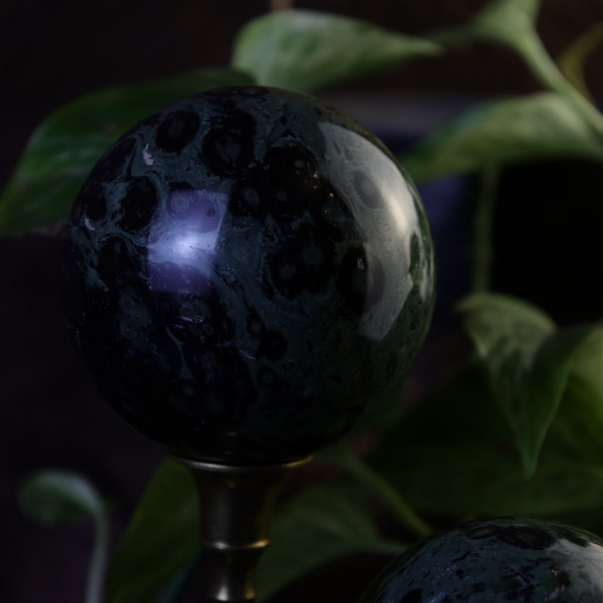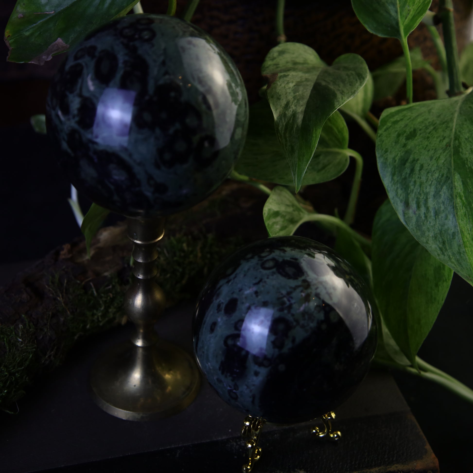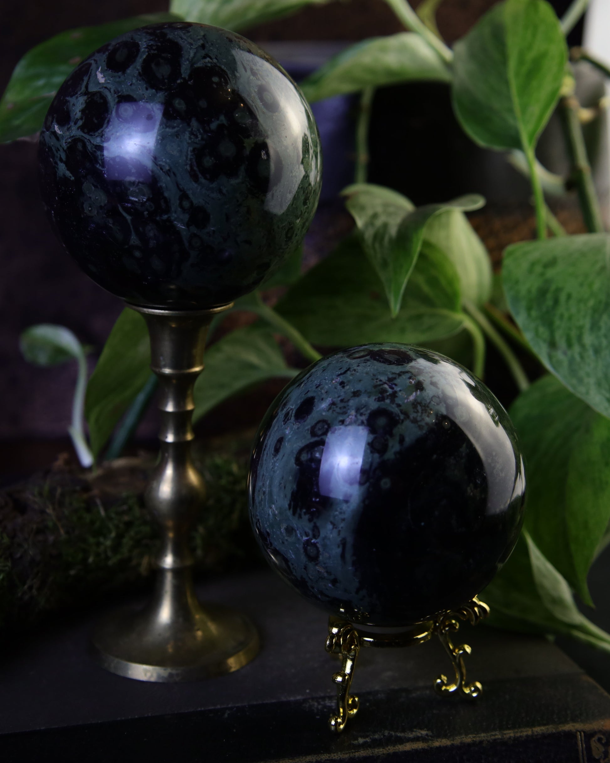 Wunderschöne Eldarit Kugel auf Silber oder Goldenen Metallständer.